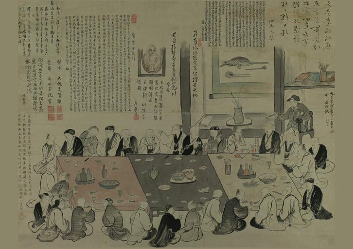 明治9(1876)年9月28日、蘭学の先人、大槻玄沢(げんたく)(磐水(ばんすい))の五十周忌を記念した追遠会が、子(次男)の磐渓(ばんけい)と孫にあたる修二(如電)、文彦の3人を祭主として開かれた。3人は相談して、玄沢の命日3月30日ではなく誕生日に会を催した。会場となった、東京本郷金助町に新築したばかりの大槻邸岳雪楼には、玄沢の肖像とともに「新元会図」が掲げられ、庭には28人の陸軍軍楽隊が整列し洋楽を奏でた。この会には、福澤諭吉も招かれ、出席していた。