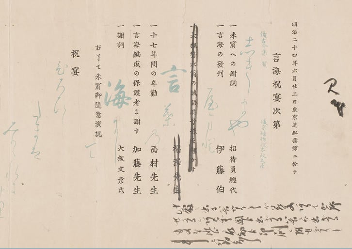 ところが、祝宴当日の明治24(1891)年6月23日、会場となった芝の高級社交場紅葉館に福澤の姿はなく、出席者に配られた「言海祝宴次第」には福澤の祝辞の記載もなかった。