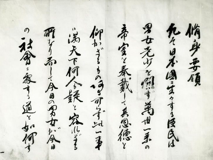 そして、明治23(1890)年には「教育勅語」が出され、以後の教育に強い影響力をもつことになる。内容は、天皇中心の国家体制を強調し、国民は天皇の家臣(臣民)として忠義・孝行などの徳目を守ることが正しい姿とされた。学校教育においては、「教育勅語」を具体化するため、科目としての「修身」でその徳目を身につけさせることとした。