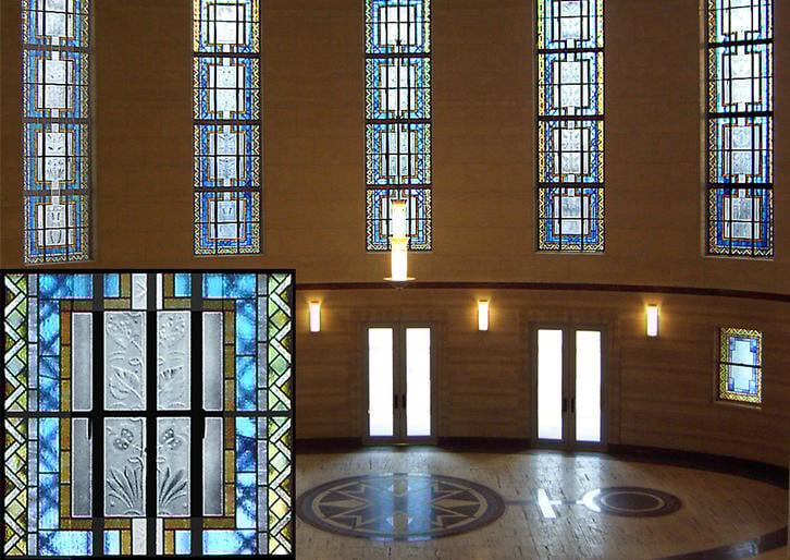 大学時代、欧米文化に興味を抱きふらんす文化研究会に所属して長期間欧州研修に行き本場の装飾ガラスに触れた経験を生かし、建築用ステンドグラスの業容拡大に貢献し今に至っています。作品制作と共に大阪証券取引所ビルの改築時のステンド修復、大阪府庁舎正庁や住友銀行本店の大天井・大窓のステンド修復など、昭和初期の装飾ガラス再生も多く手掛けました。修復分解すると補強法など創意工夫を重ねている跡が良く分かり、当時の知恵や情熱を後世に継承したく思います。
