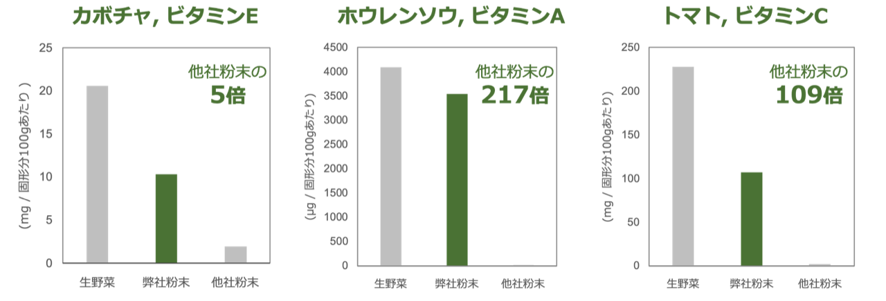 一般的に野菜は乾燥させた上で粉末化される。しかし、この方法は野菜を乾燥させる際に、長時間高温に晒されるので、野菜本来の持つ色や香り、栄養成分が損なわれることが課題であった。品質の高い粉末をつくるためには、野菜を乾燥させる際に、熱による影響や成分の酸化を抑えなければならない。そこで筆者らは熱をほとんどかけずに短時間で野菜を乾燥及び粉砕する技術の研究に着手した。当該技術は、野菜の表面を乾燥すると同時に、粉砕することによって表面積を拡大し、瞬間的に粉末化する特徴を有する。これによって、野菜は短時間の加熱にしか晒されず、成分が保持される。この効果を定量的に示すために、従来技術によって製造された他社の野菜粉末と栄養成分を比較すると、数倍から数百倍高く保持されていることが明らかになった(図2)。