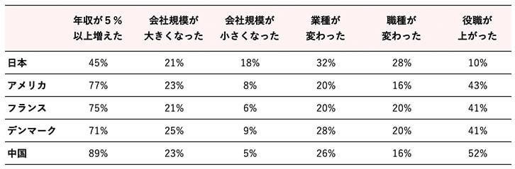 また、転職によって「役職が上がった」の割合も、他国では40%以上なのに対し、日本は10%に留まる。一方、転職によって「会社規模が小さくなった」の割合は、日本は18%と他国に比べて10%近く高い。