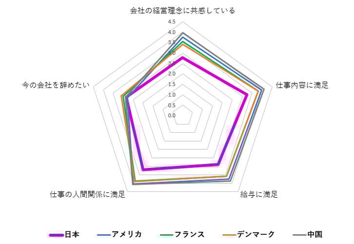 一見して、他国に比べて日本の波形は小さく、日本人は企業との関係性に満足していな人が多いとわかる。経営理念に共感できず、仕事や給与、人間関係に不満があるのに、同じ職場で働き続けるのは、個人にとって幸せとはいいがたい。企業にとっても、不満だらけの従業員よりも、満足度が高く働いてくれる従業員が多いほうが望ましいはずだ。