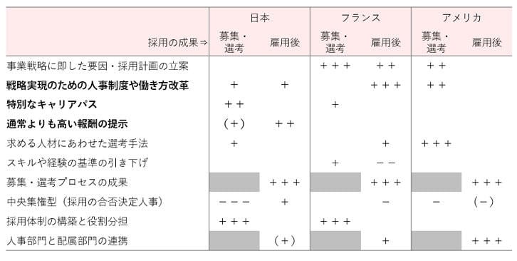 「通常よりも高い報酬の提示」は、日本企業では効果的にもかかわらず、アメリカ企業やフランス企業では統計的に有意にその効果が観察されない理由は、アメリカ企業やフランス企業は前述したように、管理職や高度専門人材といったタレント採用では、外的公正を考慮した報酬提示をすでに行っているため、報酬の引上げだけでは採用競合との差別化にならないからだろう。一方、日本企業は他社の評価が高い人材であっても、自社の賃金・人事制度の範囲でしか給与を提示してこなかったため、その制約を取り払うことで、採用力を高めることができる。