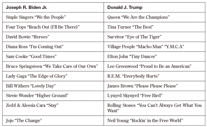 上の表は両陣営が選挙戦で多く流した曲のリストである。皮肉なことに、クイーン、ヴィレッジ・ピープル、エルトン・ジョン、R.E.M.、ローリング・ストーンズなどのアーティスト/グループはトランプ陣営での楽曲使用を認めておらず、その妥当性をめぐって裁判で係争中であることがたびたび報じられた。だが、こうした無断使用は必ずしもトランプにネガティヴなイメージを付与するわけではなく、むしろ(腐敗した)ハリウッド・エスタブリッシュメントにひとり戦いを挑み続ける闘士という彼の(支持者にとっての)イメージを強化した。トランプ陣営の選曲は1960年代から80年代の「クラシック・ロック」が多いのが特徴だが、カウンターカルチャー世代の一部が年齢を重ねて保守化したことが窺えるだろう。