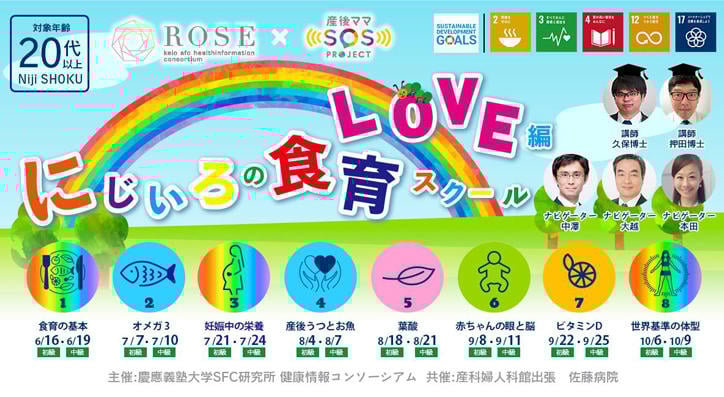 私たちが進めている食・栄養に関する研究活動については、2021年12月に開催された国連東京栄養サミットの農林水産省主催公式サイドイベントにおいてコミットメントを発信しました。具体的には、2030年までに「産学官民連携によるICTを活用したESD(Education for Sustainable Development)食育啓発活動」を通じて栄養状態の可視化と教育啓発プログラムを開発し、若年女性と子どもの栄養改善に取り組むことを宣言しました。これらの活動を通じて、全ての人々が必要な時期に食・栄養に関する知識を持ち、自らの意思と選択によって疾病を予防できる健やかな社会実現を目指すことは、国連の持続可能な開発目標のゴール(Sustainable Development Goals : SDGs)のうちの「ゴール2(飢餓をなくす)」「3(健康)」「4(教育)」「5(ジェンダー)」に貢献します。今後も企業の皆様のご支援・ご協力を得て、積極的に進めて参ります。〝にじいろ〟をキーワードにしたESD食育啓発活動に、ご期待ください。