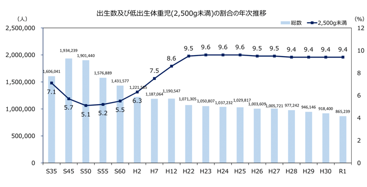 健康機器メーカー・元研究員の私は、現在、大学の研究者として健康情報科学の研究に従事しています。IoT(Internet of Things)技術を用いて、人々の健康の状態を「見える化」し、「健康課題を抽出」することで、必要な人へ、必要な健康情報を迅速に届ける仕組み「健康情報プラットフォーム構築」の研究をしています。近年、我が国では、低出生体重(2,500g未満)が増えていることを皆様はご存知でしょうか*1(図1)。
