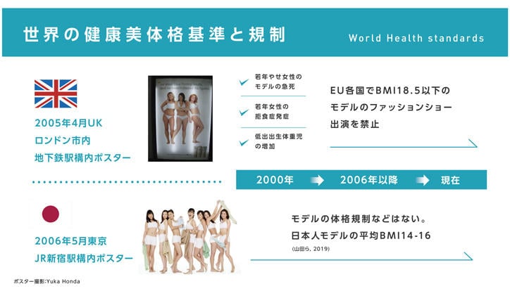 世界では栄養不⾜と栄養過多が併存する「栄養不良の二重負荷」の拡大が大きな問題になっています。新型コロナウイルス感染症は、この問題に拍車をかけていますが、その一方で、我が国においては若い女性の❝摂食障害❞が急増していると報告されています*3。若い女性のやせは、低出生体重児出産のリスク以外に、糖尿病リスクの増加、不妊、骨量減少に影響する可能性があります。早期の「やせ対策」は将来的には医療費削減にも繋がることから、いくつかの先進国では、2000年頃から若い女性の「やせ」に関する社会・政治的な規制が設けられています。その一方、日本では規制はなく(図2)、未だにやせている女性が美の基準で、メディアではもてはやされています。