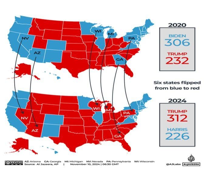 2017年に発足した第1次トランプ政権誕生に重要な役割を果たしたプロテスタントのキリスト教福音派であるが、第1次トランプ政権期間に3人の保守系の最高裁判事を任命することで、中絶権を認めていた「ロー対ウエイド判決」をひっくり返し、実質上の中絶の非合法化への道を開いた。そのため今回の選挙では、中絶は取り立てて争点になることはなかった。中絶の非合法化を後押ししたキリスト教福音派が、今回の選挙で再びトランプ支持に回るかは不明確であったが、実際にふたを開けてみるとバイブル・ベルト諸州は共和党勝利を意味する真っ赤に色塗られた。2020年にバイデンが取ったジョージア州も今回トランプが奪還、本来バイブル・ベルトには含まれていないテキサス州も、すっかり共和党の州としてその存在感を見せつけた。