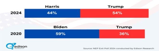 米国では少数派のカトリックは従来、民主党支持の傾向が強かったが、それに本格的な変化が生じたのが、今回の2024年の選挙でのトランプ勝利に貢献したカトリック票の動向である。全カトリック票の58%がトランプに集り、ハリスは40%弱に留まり、完全なる逆転現象が起きた。その理由はその多数派がカトリックのヒスパニックで、こちらも白人に対し少数派であることから従来民主党への支持が顕著だったのが、多くのヒスパニック票がトランプに投じられたからである。