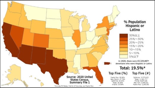激戦州と呼ばれる、選挙のたびに民主党か共和党支持かが入れ替わる7州には、ラストベルト(錆地帯=衰退した北部工業地帯の諸州)とサンベルト(日照時間が長い南部の諸州、近年諸産業誘致で雇用拡大)が含まれるが、ここでもヒスパニックのカトリック票が動いた結果が見られた。図2の2020年と2024年を見比べるとサンベルトの1つであるネヴァダ州とアリゾナ州が16年と20年と続けて民主党が取ったが、今回2024年にトランプが民主党から奪い取り、さらに図3を見ると、これら南西の諸州は近年ヒスパニック人口が25%もしくはそれ以上の州でもあることがわかる。