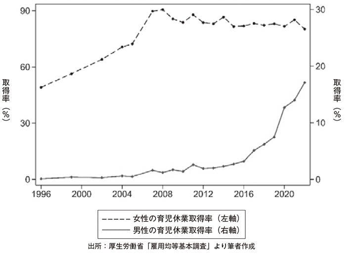 しかしながら、日本では、育児休業をとるのは専ら女性で、男性による取得は低い水準にとどまっています。図1を見ると、女性の育児休業取得率は、1996年の49%から徐々に上昇し、2000年代中頃からは80%超を安定的に推移している一方、男性の育児休業取得率は、2007年に1%を初めて超えて以降、緩やかな増加基調にあるものの、2022年は17%にとどまっています。ただし、2025年までに30%までに上げることを政府が目標に掲げていることもあり*1、近年ではその増加基調がより顕著になっている点は注目に値します。