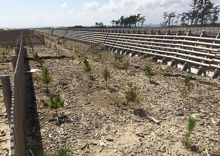 東日本大震災では、多くのマツの海岸林が津波によってなぎ倒され、押し流された倒木が被害を拡大したとも指摘された。マツの海岸林は、自然のものではなく、人間によって植林され、管理されてきた人工林である。東日本大震災で被害を受けた海岸線には、その後膨大な数のマツの植林がなされているが(写真下)、松枯れの被害が北日本に拡大していることもあり、本来の自然の海岸林を再生させることの重要性が早くから指摘されていた。