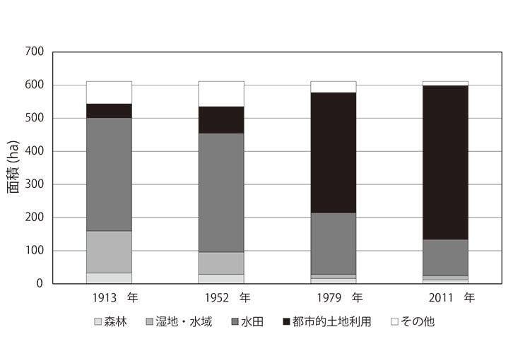 筆者と共同研究者は、環境省環境研究総合推進費(4-1505)の一環で、気仙沼市中心部の被災状況と過去約百年にわたる土地利用の変遷を分析した。その結果、1913年時点ではその大部分が水田や湿地、水域で、都市的土地利用は一部であったことが分かった(図1)。