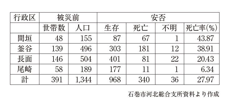 大川地区は石巻市北部、新北上川河口域の海と川と山が合わさる場所にあり、2489人が暮らしていた。東日本大震災により418人が命を奪われ、河口に近い四集落(間垣(まがき)、釜谷(かまや)、長面(ながつら)、尾崎(おのさき))は災害危険区域に指定された。川を遡った津波により河口から3~5km離れた集落での被害が大きく、釜谷では3割、間垣では4割を超す住民が犠牲となった。釜谷集落にあった石巻市立大川小学校では、児童74人、教職員10人が死亡・行方不明となった。