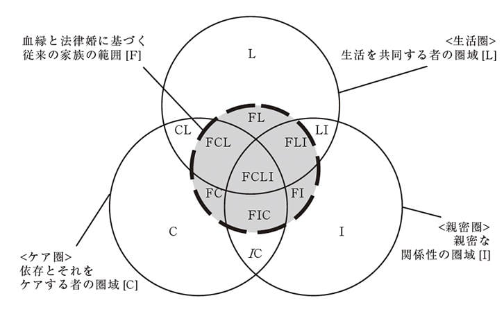 社会的養護が家族を考える上で重要である理由は、それが「家族的機能を果たす非家族」として位置づけられるからである。図1は、これまで「家族が果たすもの」とされてきた機能を分析的に図式化した久保田裕之*4によるものである。久保田は、これまで「家族のもの」とされてきた諸機能として、依存者に対するケア(C)、共同生活(L)、成人同士の性愛を含む親密な関係性(I)の3つを挙げ、それが担われる圏域をこの図のように整理した。その上で、これらの諸機能の束を出発点とせず、家族と非家族という境界を超えてこれらの機能が立ち現れる場面を分析することで、「家族とは何か?」という大きな問いを考えることも可能になるという。なおこの図に示される通り、久保田は3つの圏域が重なっており、かつ血縁と法律婚にもとづく集団を「従来の家族」としている。これは「異性愛のカップルとその血がつながった子ども」によって構成される近代家族とほぼ同義といえよう。以下、本稿においても家族とはこうした集団を指すものとする。