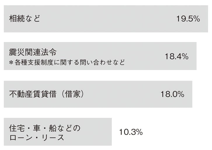 宮城県石巻市は、東日本大震災当時、人口約16万人の都市であったが、津波により3,600名以上が犠牲となり、工業地帯も中心市街地も壊滅的被害を受けた。同市における被災者のリーガル・ニーズの傾向を図式化したものを見ると、賃貸借契約を巡る多種多様な紛争、住宅ローンが払えないとする悲痛な叫び、遺族の悲しみと暮らしの先を見通せない絶望、公的な給付や住まいの支援を求める声などが色濃く浮かび上がった。生活再建に向けて複雑な法制度を利用しなければならない課題が、被害状況を反映したかたちでひしめいていたことが分かる。目に見えない被災者のリーガル・ニーズが、具体的な数値として視覚化されたことは、被災地のリアリティを政策担当者やメディアへ訴える効果を生んだ。