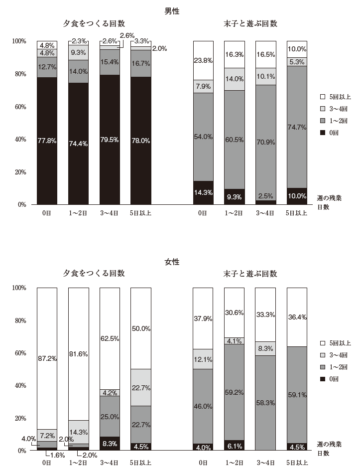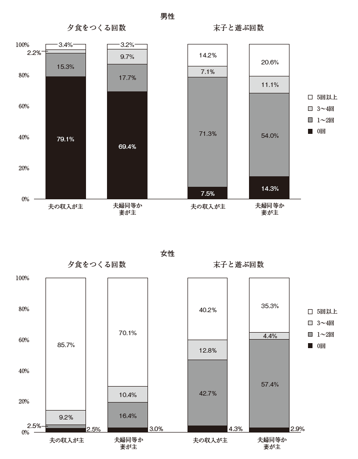 しかし、女性は、夫と同等かそれ以上の稼得役割を担っている場合でも、夕食をつくる回数が男性より圧倒的に多い。家計分担に見合った家事分担になっていない。残業が週に5日以上の場合でも夕食を週に5回以上つくっている女性は半数におよぶ。それだけ女性は伝統的な性別役割の拘束が強いといえる。女性の仕事と家事の二重負担を解消するために、もっと女性が家事をしなくて良い社会のあり方を検討することは重要な課題であるといえる。