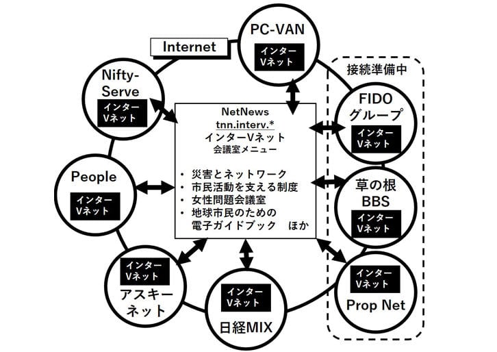 日本での災害支援への情報技術(IT)の活用は、1995年の阪神・淡路大震災が始まりと言われている。この年はまた、「ボランティア元年」とも呼ばれている。地震で倒壊した高速道路や、その後発生した地域全体を焼き尽くす火災といった未曾有の災害を目の当たりにして、日本中の各地から医療職、会社員、学生などの幅広い層の人々がボランティアとして現地に赴き、家屋の片付けや物資の配布などの救援活動を行った。この「共助」を担う震災ボランティアたちが情報発信の手段として注目したのが、当時まだ十分には普及していなかったコンピューターネットワークである。阪神・淡路大震災が起きた1995年当時は、我々が現在利用しているような商用のインターネット接続サービスは普及しておらず、個人は、「パソコン通信」と呼ばれるサービスを使って電子掲示板やチャットによるコミュニケーションを行っていた。「インターVネット」は、それぞれ独立したクローズドネットワークであるパソコン通信サービスを、インターネットのNetNewsというしくみを介して中継し、震災に関する情報をすべてのパソコン通信サービスで共有できる電子掲示板を作ろうという試みで、慶應義塾大学の金子郁容教授(当時)らによって立ち上げられた。当時大学院生であった筆者もこの取り組みに参加した一人で、このシステムを動かすサーバコンピュータの管理に携わっていた。