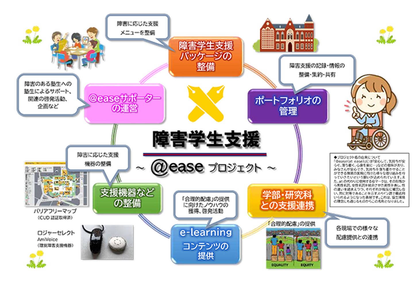 なお、「@ease(at ease)」という言葉には「安心して、気持ちが安らぐ、落ち着く、心身を楽に……」などの意味がある。「障害学生支援」という言葉が持つ固いイメージに引きずられることなく誰もが安心でき、気持ちを落ち着かせることができる環境の実現に向けたさまざまな取り組みを行っていきたいという願いをこの言葉に込めている。