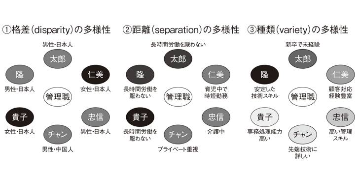 格差の少ない状態を作ることができれば、次にアプローチすべきは「距離」の多様性である。例えば、性別や子どもの有無といった属性ではなく、プライベートの時間を作るために定時で帰りたい、または経験値や収入の面でなるべく長く働きたい、といった価値観の違いによって発生するメンバー間のコンフリクトを最小化する必要がある。そのためには、価値観の多様性を前提とすることと、価値観以外の評価基準が必要である。例えば「職場に長時間いることがよい」という価値観が強い職場では、早く帰りたい人が後ろめたく感じたり、周りから非難されたりするというコンフリクトが生まれる場合があるが、「成果さえ出せば退社時間は個人の判断に任せる」という組織の風土や、それを率先垂範する上司の下では、こうしたコンフリクトは生まれないだろう。