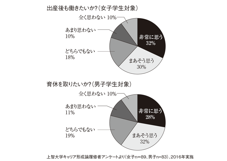 なお、これまで多様性と言いながら女性だけについて論じているように聞こえたかもしれないが、これは日本の企業における多様性の課題を、女性が主に体現しているからである。そしてこれからの時代は、この課題は女性に限ったものではなくなっていく。例えば筆者が大学3年生を対象にとったアンケートからは、男性も女性も6割が育児と仕事の両立をしたいと考えていることが分かる(図4)。今後、こうした価値観の多様性を認められない職場には、男女ともに人材が集まらなくなっていくであろう。