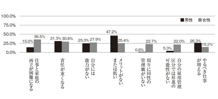 しかしこの原因を「女性の意欲の低さ」に求めるのは少し早急である。同調査の「昇進を望まない理由」を見ると、女性で最も回答が多かったのは「仕事と家庭の両立が困難になる」(36.5%)であり、家事・育児との両立支援策なしには仕事上の責任を背負う気にならないことが分かる(図2)。ここに男女の社会的役割に関する価値観の隔たり、つまり「距離」の多様性が職場組織に与える影響が垣間見える。