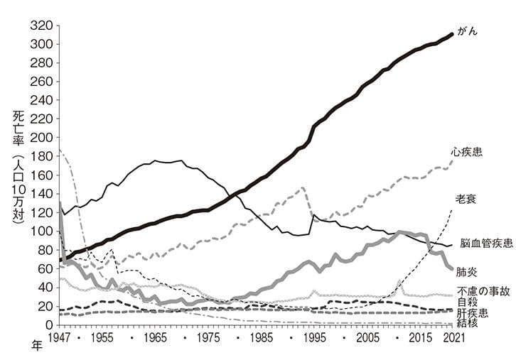 老衰は、他に記載すべき死亡の原因がない高齢者の自然死を指す。衛生環境や栄養環境の改善を背景に、病気によらない死亡が増えているのである。病気はしばしば若い世代の生命を奪うが、「病死の減少が平均寿命を延ばしている」(馬場園明・九州大学教授)という。