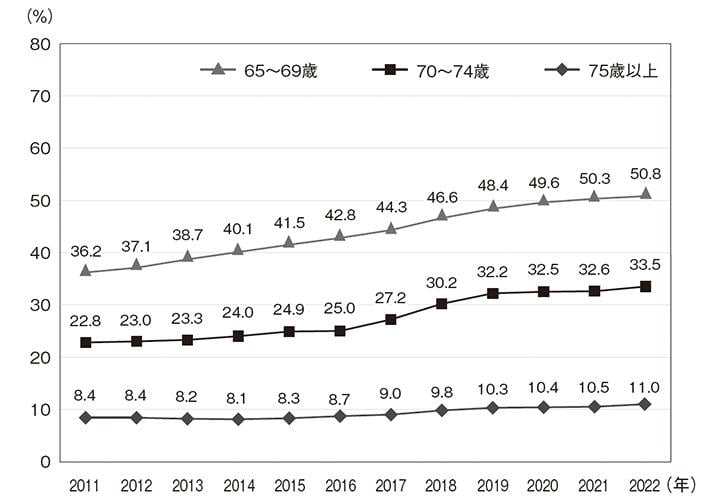 総務省「労働力調査*7」によれば、2022年時点の65歳以上の就業率は男性=34.2%、女性=18.3%。男女合計では25.2%となり、10年前に比べて5.7ポイント上昇している。男女合計の就業率を年齢別に見ると、65~69歳=50.8%、70~74歳=33.5%、75歳以上=11.0%になる。