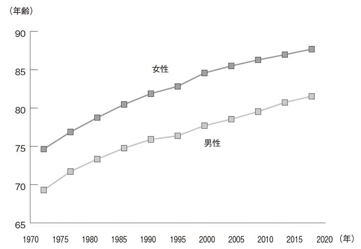 平均寿命が延びることに伴い、健康に活動できる期間を指す健康寿命も延びている。厚生労働省が2021年12月に発表した「健康寿命の令和元年値について*6」では、2019(令和元)年時点の健康寿命を男性=72.68歳、女性=75.38歳と推計する。平均してみれば、男女とも70歳過ぎまで健康上、支障なく日常生活を過ごせるのである。