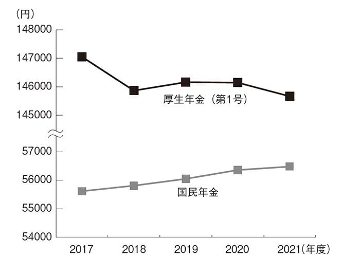 厚生労働省「令和3年度 厚生年金保険・国民年金事業の概況*10」によれば、個人事業者や専業主婦が加入する国民年金の平均年金月額は5万6479円、会社員が加入する厚生年金(第1号)の平均年金月額は、老齢基礎年金と併せて、14万5665円だった。