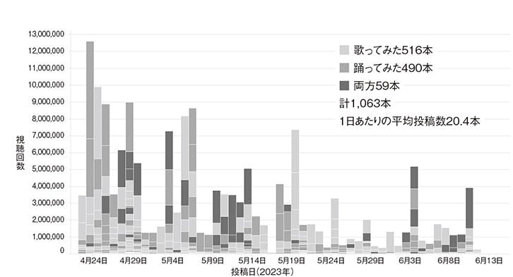 だがこの楽曲を「流行させた」のは楽曲の力なのか、歌唱の力なのか、アニメ『推しの子』の力なのだろうか。実はリリース後3カ月の間にAyaseのYouTubeチャンネルで公式にあげられた1曲が約1億回再生されたのだが、この期間に約1000人ものクリエイターがそれぞれのチャンネルで「アイドルを歌ってみた」と自分なりにアレンジして歌ったり踊ったりした動画をアップし、それもまた合計で約1億回再生されていたのだ[図2]。こうした“サブクリエイター”たちが1人あたり10万回再生されていたことになり、YOASOBIのプロデューサーたちから出てきた言葉としてはこうしたUGC(ユーザージェネレイテッドコンテンツ)による切り抜きや再編、私が定義するところの「Remixer」部分を誘発したことが勝因の大きな部分であったという。なぜならその1000人こそが本来のYOASOBI自体のファンではない、外の層を惹きこむ「拡散」役割を担っていたからだ。