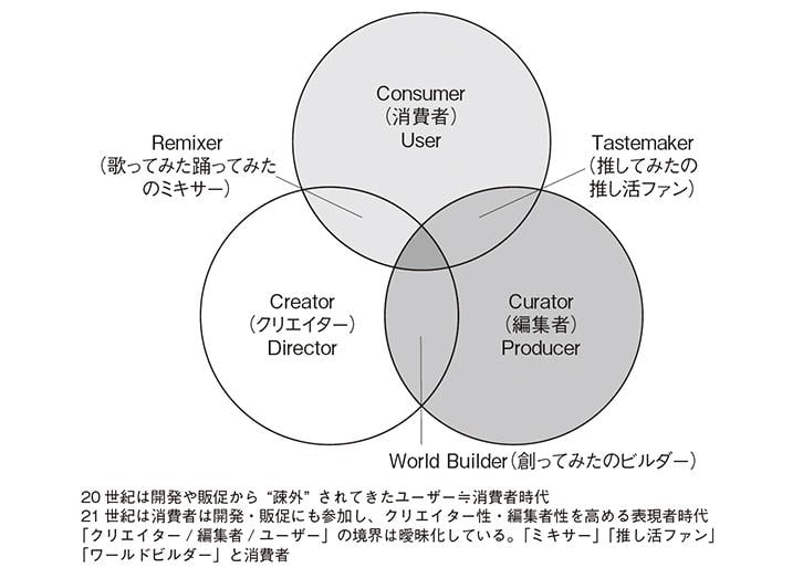 「推し活」は「消費者/編集者」の越境行為の一部に過ぎない。「ビルダー」は消費からは離れて「クリエイター/編集者」の間にあってFortniteやROBLOXで100時間もかけてバーチャル渋谷を完成させ、そこで何十人も遊ぶユーザーから投げ銭をもらうような活動だ。直近で最も活動が増えた「ミキサー」は、「クリエイター/消費者」の間で、自分自身が出役として歌い、踊り、プロも顔負けの数万人フォロワーを獲得してしまうような行為だ。時には自分自身が顔出しも声出しもしない「動画の切り抜き職人」として、ヒロユキの配信動画を切り抜いてYouTubeにアップし、それだけで何億回も視聴されて広告費を集めるような「クリエイター/編集者/消費者」の間の存在も何千人という単位で生まれてきている。そう、「推し」は消費者が越境し、作品やコンテンツの中身に関与していくプロセスの一局面なのである。消費者はもはや寡黙ではいられなくなった。ただひたすら提供されるものをセレクトして、追いかけ続けるのではない。追いかけるべきかどうかを横の関係で知らしめたり、時に布教しながら消費者たちのリーダーにもなり、切り抜きでクリエイターそのものを有名にしていくプロデューサーにもなる。推し活は受動的だった消費者が、能動性を自ら獲得していく過程なのだ。