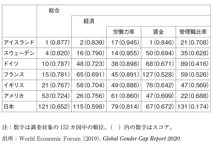 ここで、経済分野のジェンダー・ギャップ指数について、主要国と日本とを比較しておこう(図表1)。取り上げるのは、アメリカ、イギリス、ドイツ、フランスの4カ国と、この指数が第1位であったアイスランド、労働市場や社会保障に関して注目されることの多いスウェーデンである。