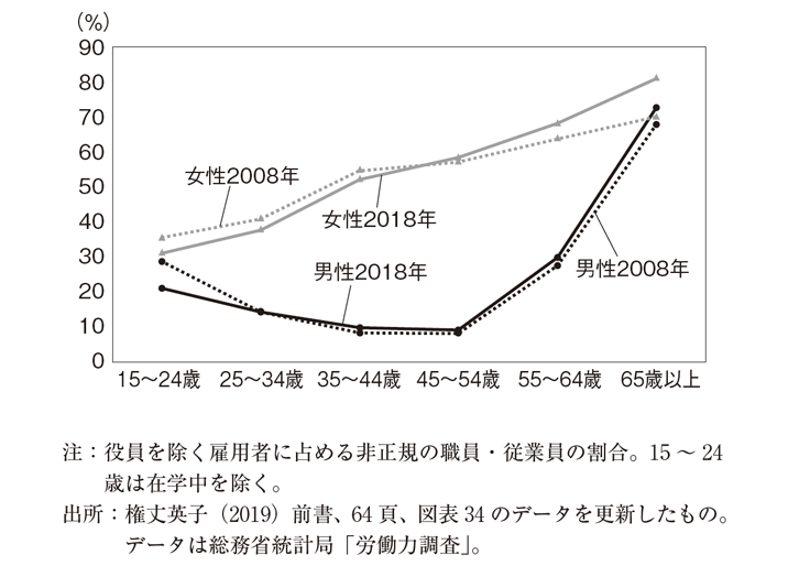 このグラフは、欧米諸国と比べるとかなり特異である。欧米では、女性も日本の男性の形に近く、中年以降の非正規雇用比率は低い。実際、欧米の非正規雇用比率には、男女差があまり見られない。例えば、非正規雇用比率(全年齢)の低いアメリカで男性4.1%に対し、女性3.8%(2017年)、この比率の高いスペインで男性26.0%、女性27.7%(2018年)であった(OECD調査) 。