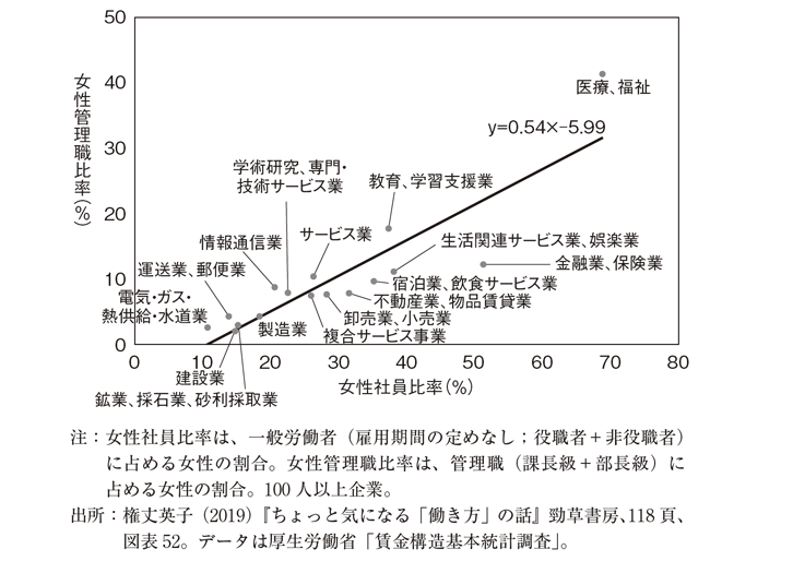 図表2は、産業別の女性管理職(課長級+部長級)比率と女性社員比率(社員全体に占める女性の比率)の関係を示している。この図から、女性管理職比率には業種ごとに大きな差があること、そして女性社員比率が高い産業ほど女性管理職比率も高いという正の相関関係が観察できる。