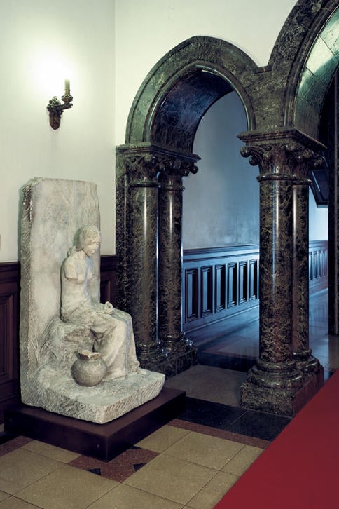 慶應義塾には日本における大理石彫刻の先駆者・北村四海(きたむら しかい)の《手古奈(てこな)》が所蔵されている。慶應義塾と縁の深い北村四海作品は数点が所蔵されているが、その中でも《手古奈》は等身大の彫像で、近代日本における最大規模の大理石作品である。本作は1909(明治42)年の第3回文展出品作で、文展終了後、塾員の仲介で図書館(現在の図書館旧館)の新築祝いとして寄贈され、竣工後の1912年4月に図書館玄関ホールに設置された。しかしながら、本作は1945(昭和20)年の東京大空襲により被災し、2つに割れて両腕部分を失うなど大きく破損。その後地下倉庫に収納され、約50年間、人目に触れず保管されることとなる。
