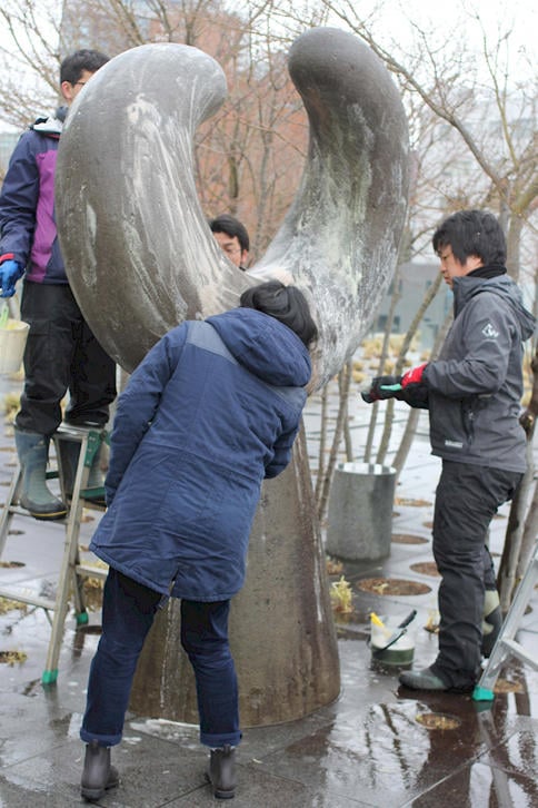 そこでアート・センターが2001年度より彫刻の保存洗浄処置に取り組み始め、委員会設置後は2年に一度のペースで実施し、現在では定例作業の1つとなっている。メンテナンス時には専門家による作品状態の観察、表面の汚れの洗浄を行っている。ブロンズ作品に関しては洗浄した後、良好な撥水性が維持されるよう表面に保護用のワックスを塗布し、最後に光沢を調整する。これら一連の作業によって彫刻の魅力が蘇るのである。きちんとケアされた屋外彫刻は、美しいキャンパスの景観を作り出す重要な要素となっている。さらに、近年は一貫教育校の生徒が彫刻洗浄に参加するケースもあり、実際に彫刻に触れながら保存活動に参加できる良い学びの機会にもなっているのである。