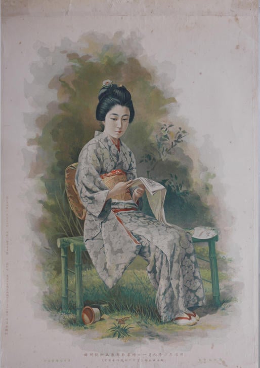 正月以外では、まず1897(明治30)年9月1日付で第5000号の発行を記念した岡村政子の《美人新聞を読む図》(図4)が挙げられる。背景を描き残すことで際立つ女性の表情からは、手にしている『時事新報』から何かを読み取っていることがうかがえる。この絵付録は、「女性も読んでいる『時事新報』」というキャッチコピーでも似合いそうな、フェミニスト福澤諭吉の面目躍如であろう。