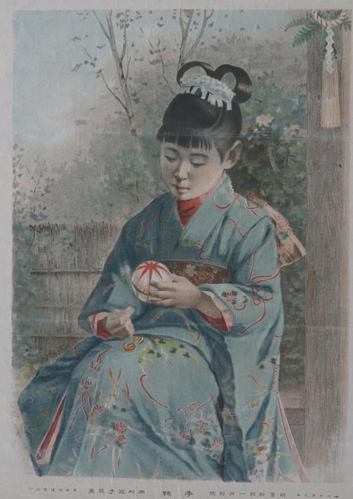 新聞の正月絵付録としては、明治20年代の『東京朝日新聞』による生巧館の木口木版画がよく知られている。他紙では明治20年代後半から色刷の正月絵付録が付いていた。時事新報社は前述の1895(明治28)年の岡村政子《手鞠》で、翌年こそ発行はなかったものの、その正月絵付録合戦に参加する。