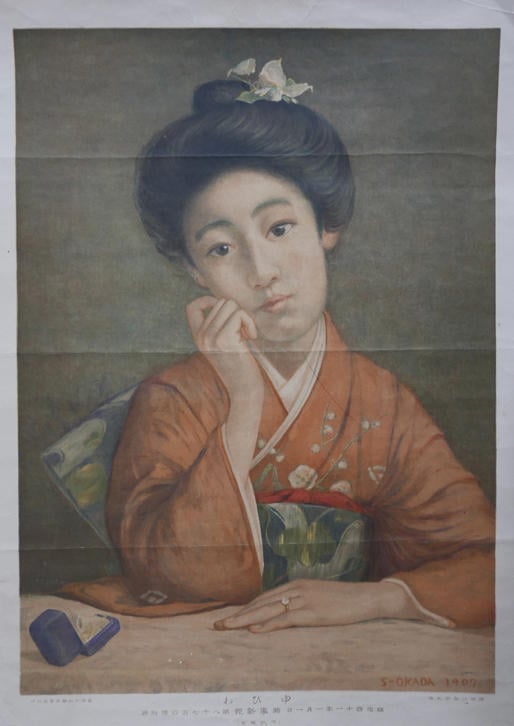 1907(明治40)年から翌年にかけて、時事新報社はシカゴ・トリビューン社による世界美人コンテストの国内大会を主催。その時の《ゆびわ》(図3)は、本邦初の素人を対象とした美人コンテストとして読者の関心を煽る目的で発行された。原画は、美人画で名を馳せ、その審査員でもあった岡田三郎助が描いた。和服の若い女性は、第1位に贈られることになる天賞堂製のダイヤモンドの指輪をはめてうっとりしている。