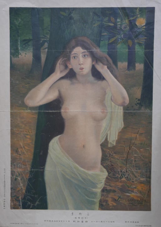 1904(明治37)年の《こだま》(図2)は、和田英作のフランス留学からの凱旋を示す作品で、主題はギリシャ神話のニンフ、エコーである*4(原画は泉屋博古館蔵)。だが、人間でないとはいえ、上半身をあらわにした若い女性が描かれているこの絵を、子供のいる一般家庭に飾るには現代でも躊躇するのではなかろうか。それほど時事新報社の絵付録は大胆でさえあった。