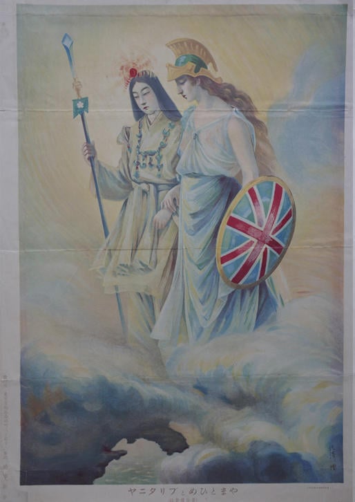 1902(明治35)年1月30日に締結された日英同盟を踏まえ、エドワード7世の戴冠式が挙行される予定だった同年6月26日には、時事新報社専属の漫画家北澤楽天原画の《やまとひめとブリタニヤ》(図5)が絵付録になった(だが、エドワード7世が虫垂炎に罹ったため、戴冠式は8月9日に延期された)。この図柄は人気を呼び、たばこ「ハッピー」のポスターやパッケージ、マッチのラベル、そして羽織の裏地などにも使用された。