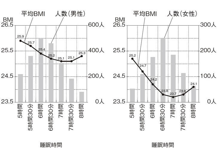 一方、筆者の監修のもと手首に着ける睡眠計を使い、睡眠時間とBMI(Body Mass Index :体重と身長の関係から算出される、人の肥満度を表す体格指数)の関係を分析したところ、「痩せやすい睡眠時間」が判明しました(図)。今回の調査の結果、睡眠時間とBMI 値の関係から「7時間睡眠」の人が、もっとも平均BMI値が低いことが判明しました。痩せやすい体にするには、睡眠時間が短すぎても長すぎても良くなく、痩せやすい睡眠時間のベストは7時間であることがわかりました。