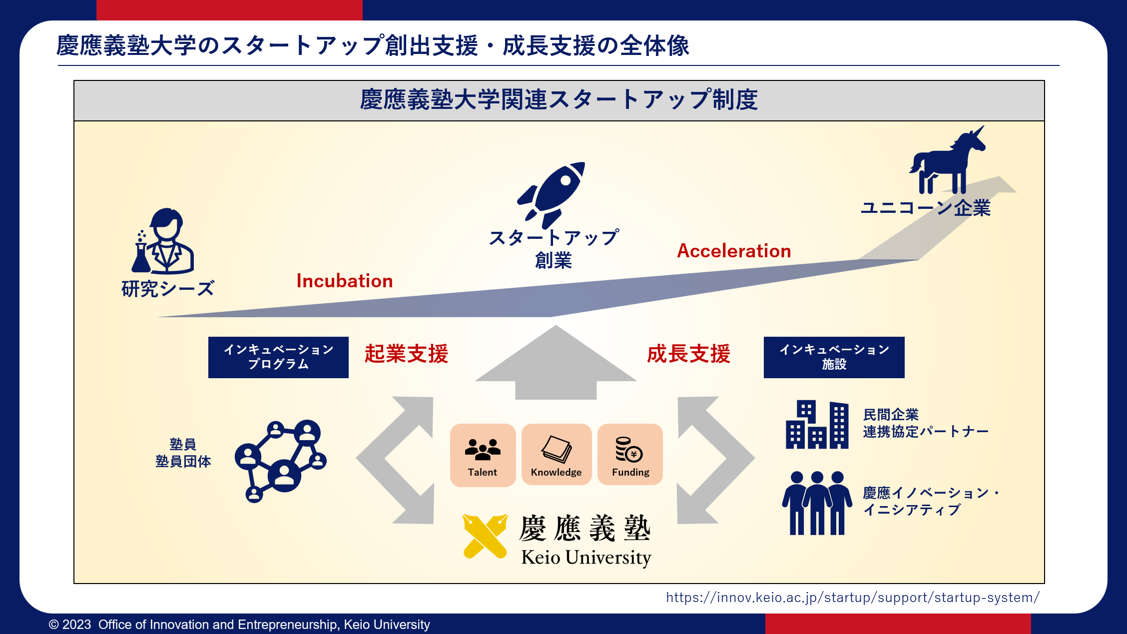 本学は、大学発スタートアップの創出を通じた研究・教育成果の社会実装のさらなる推進を目的として、「慶應義塾大学関連スタートアップ制度」を2022年12月に導入しました。