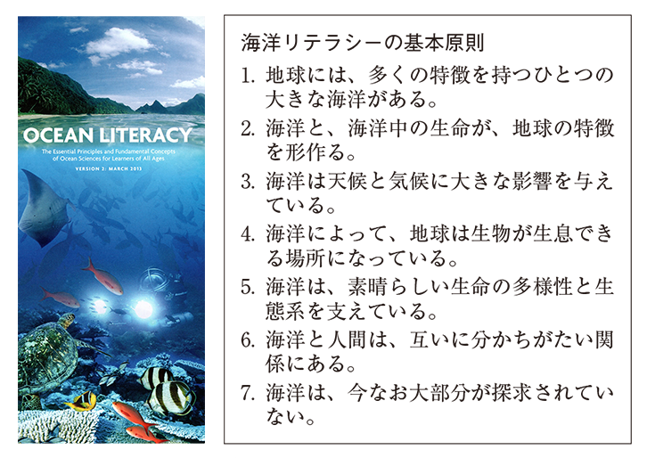 海洋リテラシーは、アメリカで初めて体系的に整理された。海洋に関する機関や組織に所属する海洋研究者、教育者、教員や行政担当者などが議論を重ね、7つの基本原則(表1)と44の基本概念を決定し、海洋科学教育コミュニティの査読を経て2005年にNOAA(アメリカ海洋大気圏局)を著作権者としてリーフレットにまとめ広く発表された。