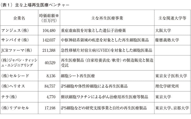 (表1)は国内で上場する主な再生医療ベンチャーの一覧である。多くの上場している再生医療ベンチャーが大学等の研究成果をもとに製品開発を行っている。再生医療ベンチャーはサイエンスなくしては成立せず、研究機関の果たす役割が大きい。例えば、iPS細胞を使った再生医療として最も実用化に近いと言われる理化学研究所の加齢黄斑変性に対するiPS細胞移植に関しては、ヘリオスが理化学研究所と特許実施許諾を締結して独占的ライセンスを受け、製品開発を進めている。加齢黄斑変性は日本人の失明原因の第4位、欧米の失明原因では第1位の疾患と言われ、進行を抑えることはできても根本的な疾患の治療法が存在しない。ヘリオスの開発パイプラインには他にも横浜市立大学から独占的ライセンスを受けた肝臓の再生医療などもあり、アカデミアと連携してアンメットメディカルニーズを解決するポテンシャルを持つベンチャーとして、株式市場では高い評価を得ている。