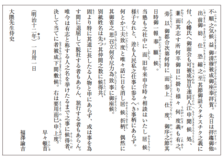 *3 早稲田大学図書館所蔵 市島謙吉編『大隈家収蔵文書(抄録)下』(早稲田大学大学史資料センター編)では、日付について、かっこ書で「明治十二年」と補足。