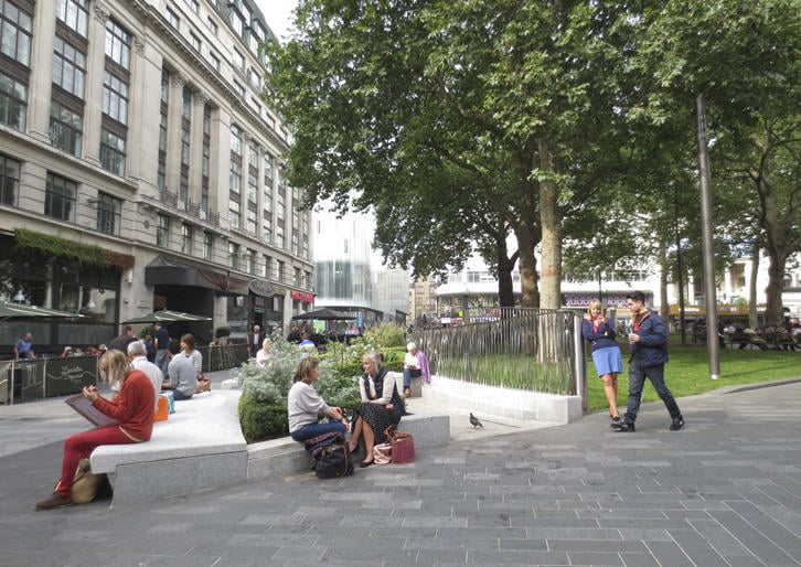 レスタースクエアの公園再整備は、ハーツオブロンドンBIDと地元自治体のウエストミンスター区との連携によって進められた。その設計を通してスクエアを囲む柵のデザインと位置を変更し、スクエア内に入ることなく柵沿いに設けられた蛇行するベンチに座って休憩することを可能とした。観光客がまち歩きの途中で、またエリアの就業者が休み時間にちょっと休むベンチとして大いに利用されている。さらに柵を軽やかなデザインとし、鬱蒼としていた植栽を整理することによってスクエアの見通しをよくし、歓楽街の中心に位置するレスタースクエアと周囲の歩道が一体化した開かれた公園を実現させている。公園に面するカフェが用意するテラス席に吸い込まれるように客は入り、公園の緑と歩道を行きかう人を見ながら談笑している。