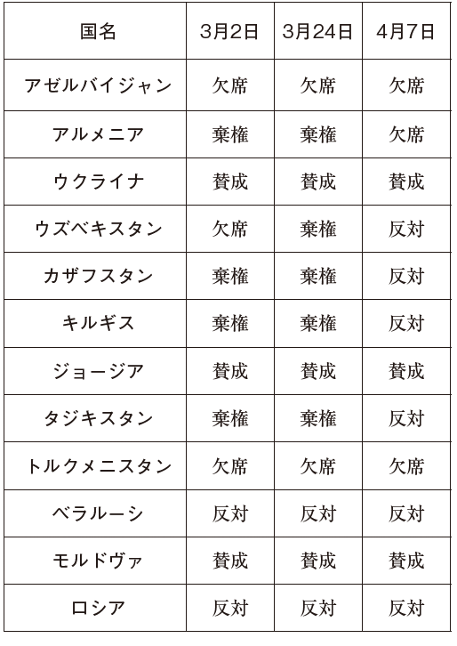3月2日の決議は「国連総会特別緊急会合のロシア非難決議」、3月24日は「国連総会特別緊急会合のロシア決議」(ロシアの責任を強調する人道決議)、4月7日は「ロシアの人権理事会の理事国資格を停止する決議」である。親欧米路線の3カ国(ウクライナ、ジョージア、モルドヴァ)は全て賛成、そしてベラルーシが全て反対であり、それ以外は基本的には欠席、棄権で意思を表明しようとしなかった。ただ、4月7日の投票は、人権問題が問われているため、旧ソ連でも人権問題が深刻な国々が反対に回ったのは興味深い。